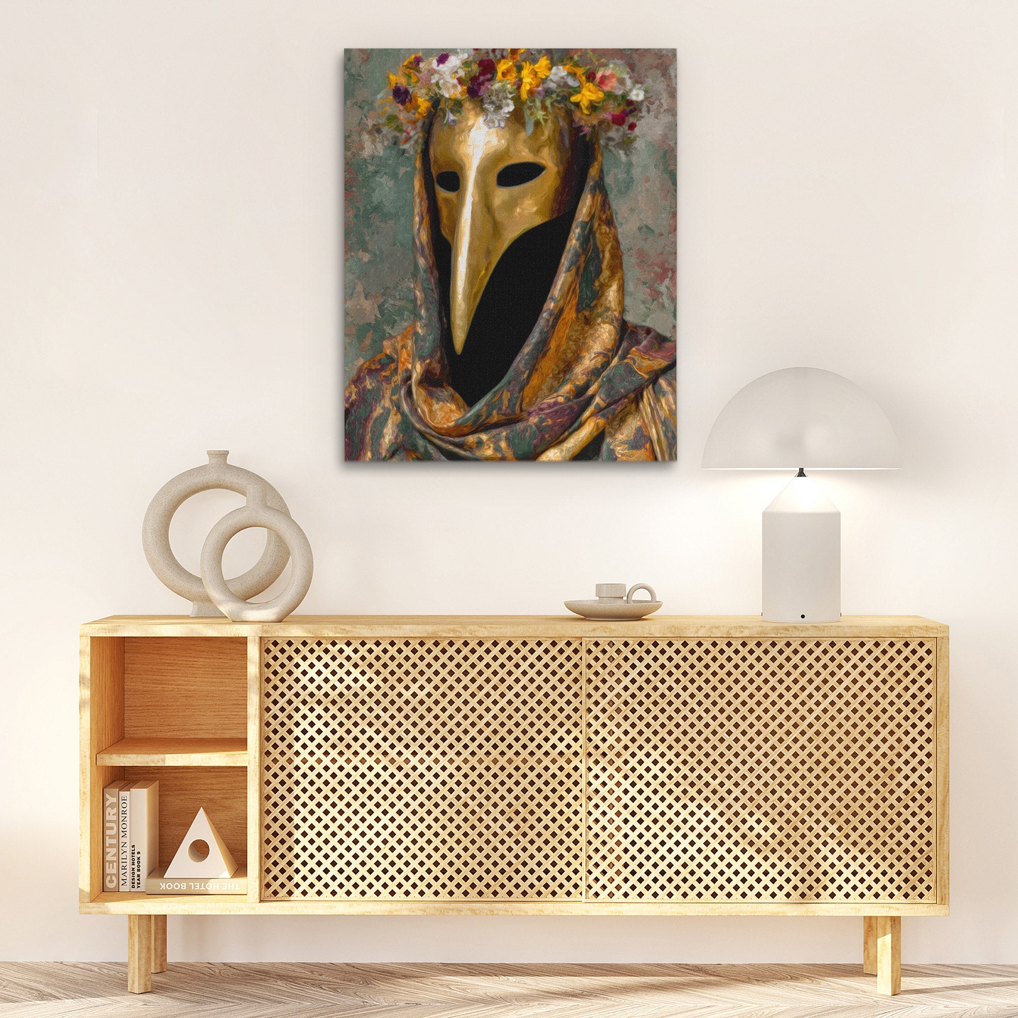A plague mask with bloom crown. Gothic and beautiful. Perfect for living rooms, bedrooms, or artistic spaces.