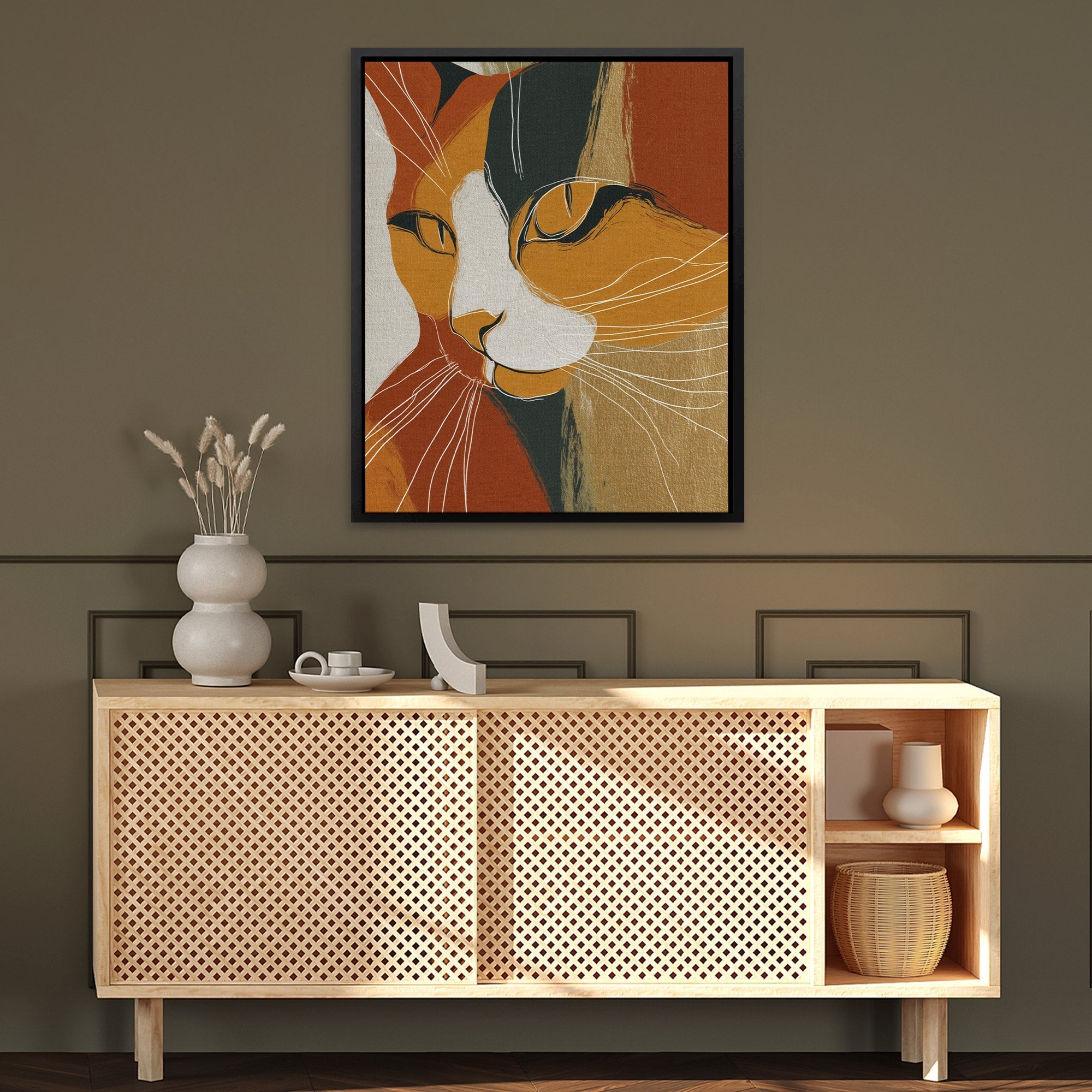A cat in warm geometric form. Modern and inviting. Perfect for living rooms, bedrooms, or anywhere cats are celebrated.