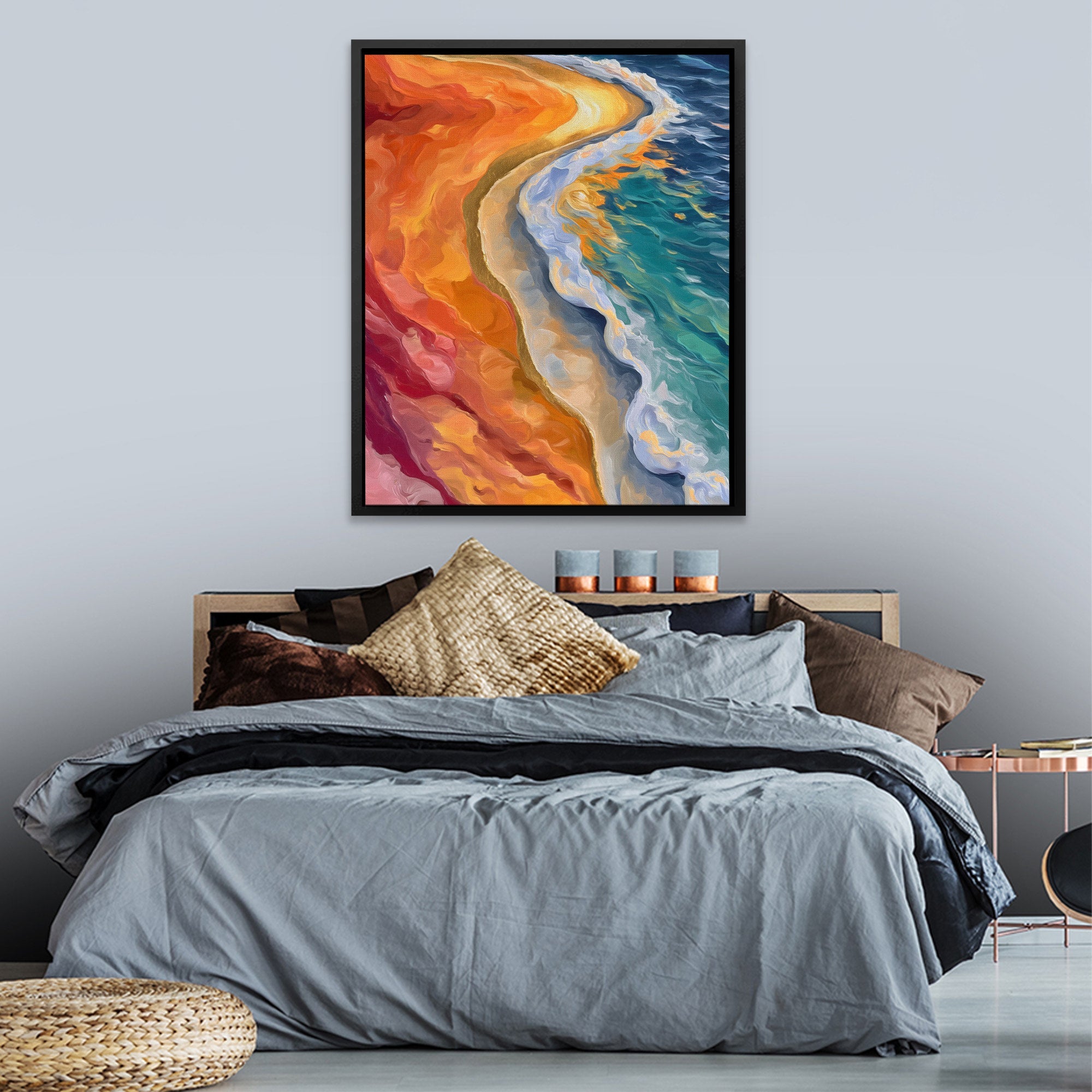 This abstract landscape captures elemental forces through flowing forms and bold color contrasts. The piece makes a striking focal point in living rooms, bedrooms, or coastal-themed spaces that appreciate dramatic natural imagery.