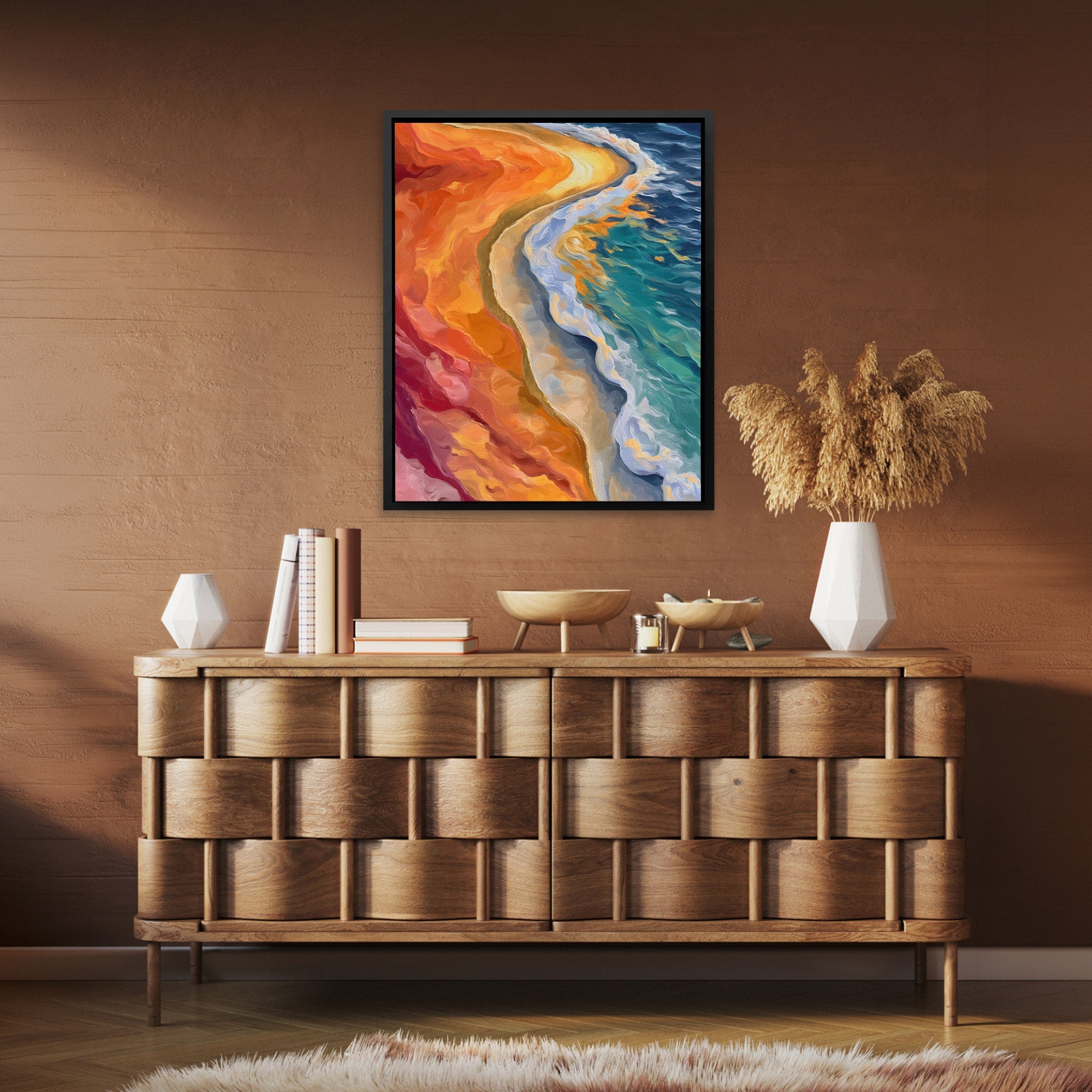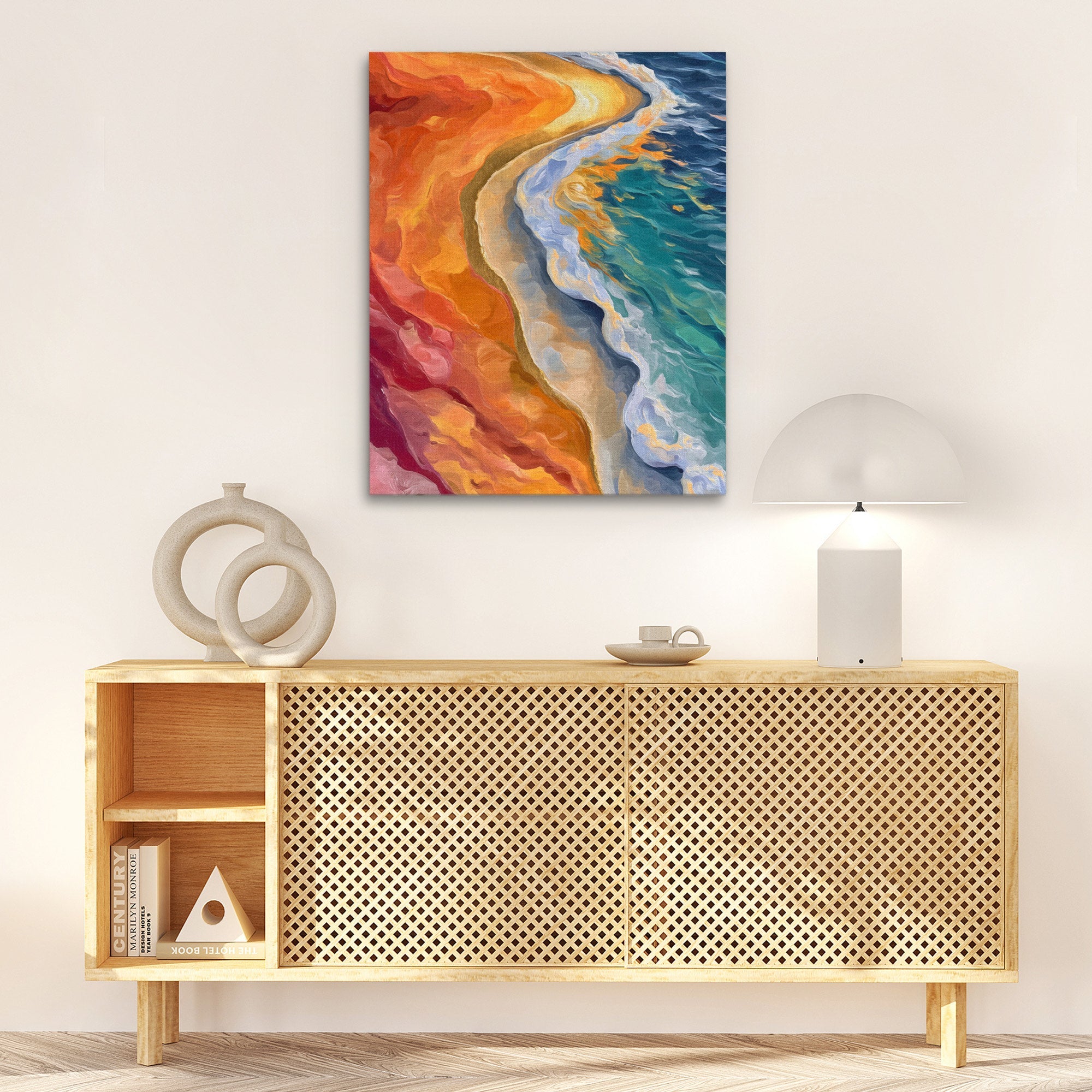 Abstract volcanic coast in orange and teal. A dramatic focal point for any living room.