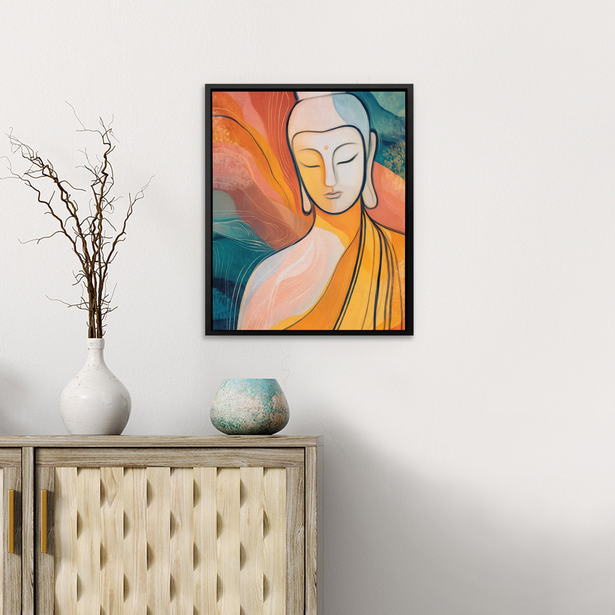 This modern interpretation of Buddhist iconography blends traditional symbolism with contemporary artistic treatment. The piece brings calm to meditation rooms, bedrooms, or any space that benefits from contemplative imagery.