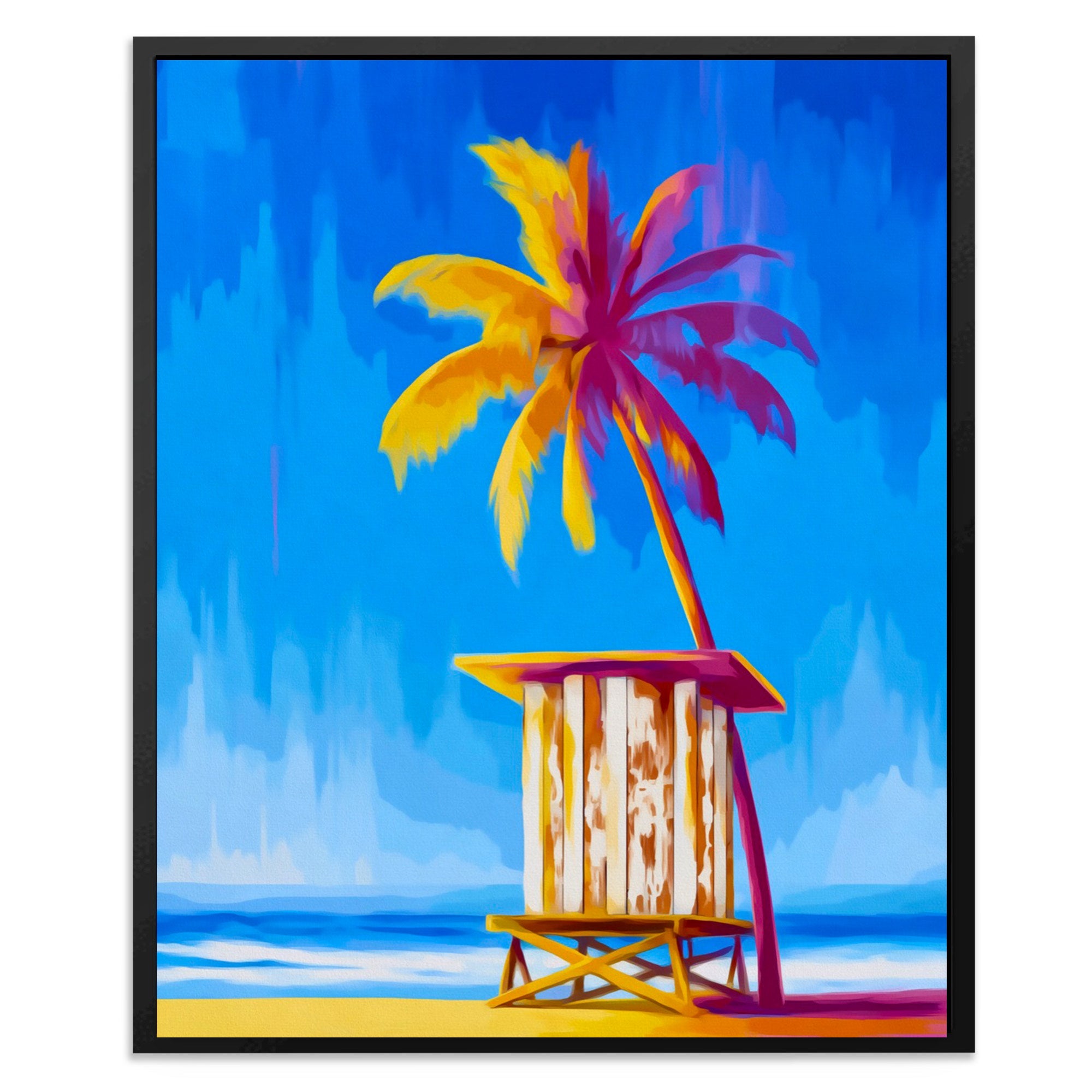 A lifeguard tower stands on a bright sandy beach under an electric blue sky. Two palm trees frame it, one golden yellow and one hot pink, both painted in bold, flat color. The tower itself has warm orange and yellow tones with pink accents. The sand is pale and clean. The whole piece feels like a vintage travel poster filtered through pop art.