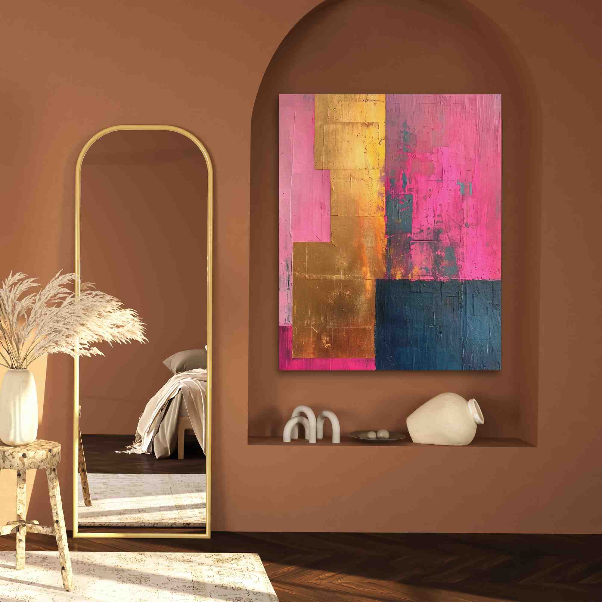 Luxurious Pink canvas art piece effortlessly blends the boldness of modern abstract with the richness of gold and the vibrancy of pink. This artwork is a statement of sophistication, featuring textured layers and a symphony of colors that speak to the trendsetters and style connoisseurs.