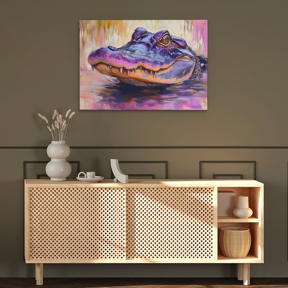 With snarling teeth and hypnotic tones, this artwork demands attention. Purple Bite turns a swamp icon into an electrifying statement piece full of color, confidence, and character. Best suited for bold interiors with a love for wild flair.