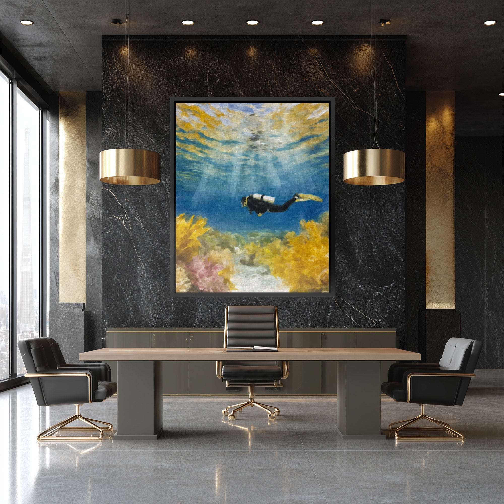 This piece captures diving's magic through artistic interpretation. The impressionistic treatment adds romance to underwater exploration.