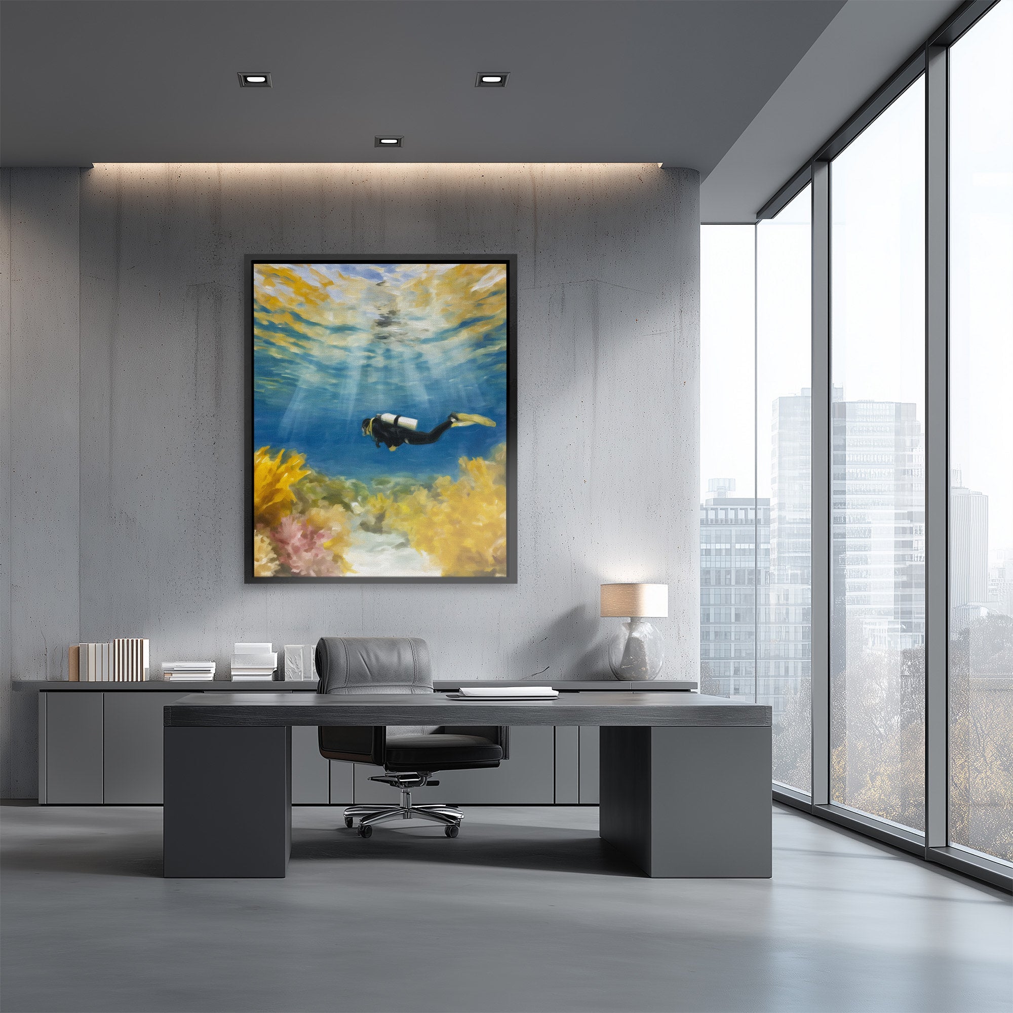 A diver floats over coral. Dreamy and adventurous. Works in beach houses, bathrooms, or ocean-themed spaces.