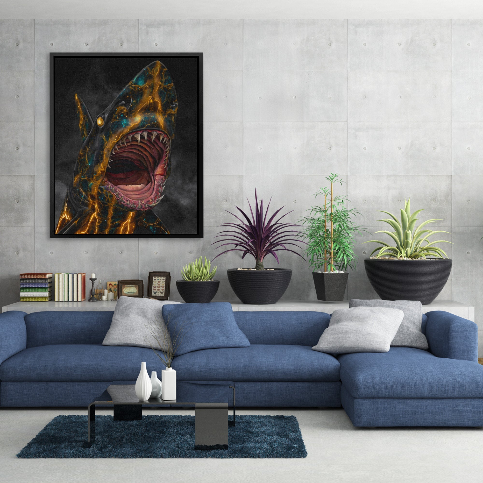 This highly stylized digital artwork captures raw predatory power through fantasy art techniques. The piece makes a bold statement in man caves, game rooms, or anywhere that appreciates marine life with an otherworldly edge.