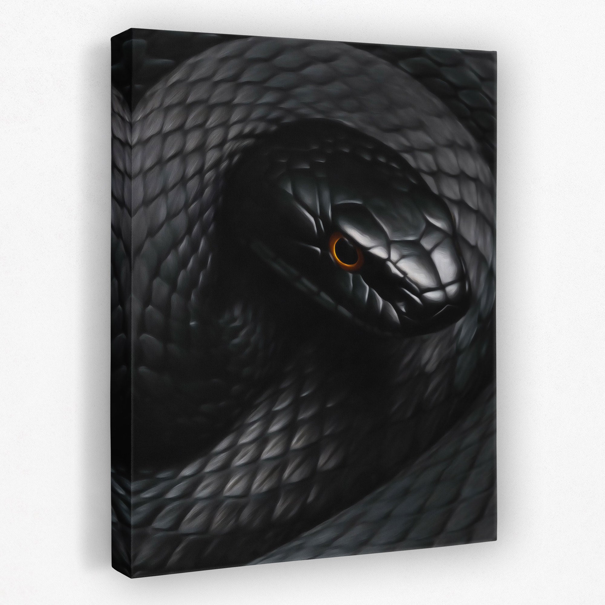 A coiled snake with amber focus. Dark, detailed, and dramatic. Works in living rooms, man caves, or spaces drawn to the mysterious.