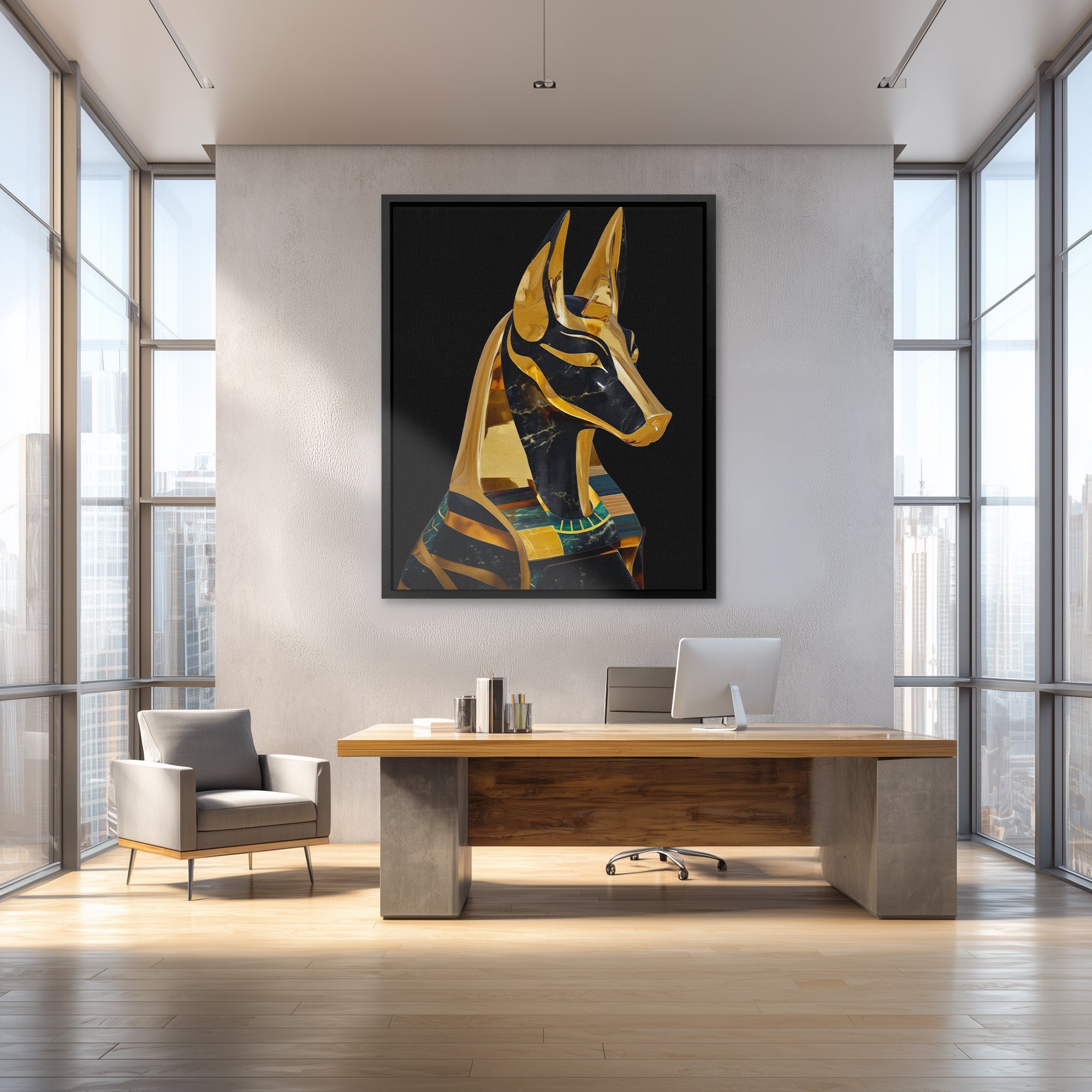 Anubis guards in golden light. Ancient and dignified. Works in living rooms, offices, or Egyptian-themed spaces.