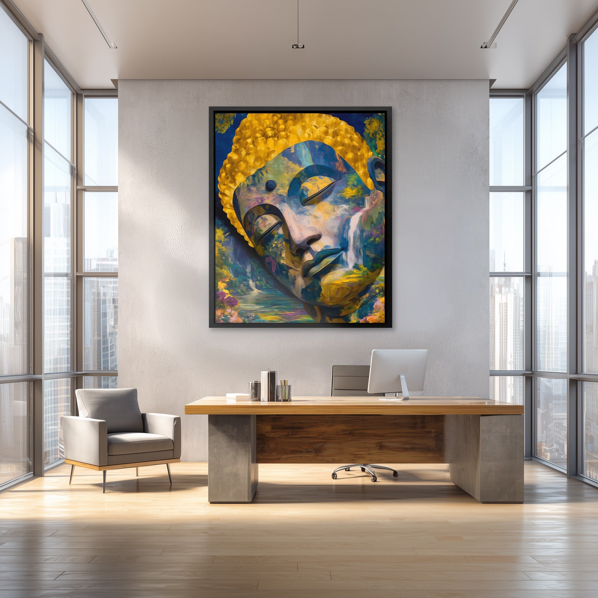 Buddha in golden surreal depths. Serene and artistic. Perfect for meditation spaces, bedrooms, or spiritual interiors.