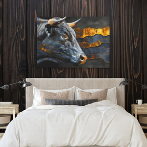 Surging Horns is a powerful depiction of a bull rendered in dramatic shades of black and gold, symbolizing strength, determination, and unyielding spirit. The bold interplay of dark hues with striking metallic accents creates a dynamic and intense visual that captures the raw energy and force of this majestic animal. This artwork is perfect for spaces that appreciate bold, statement pieces that exude power and resilience.