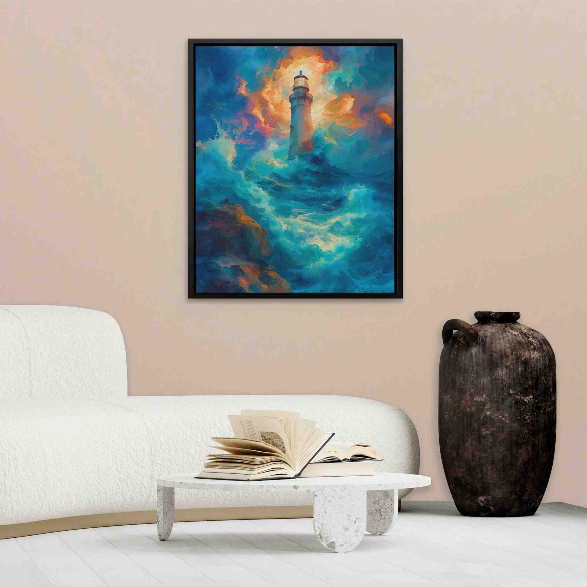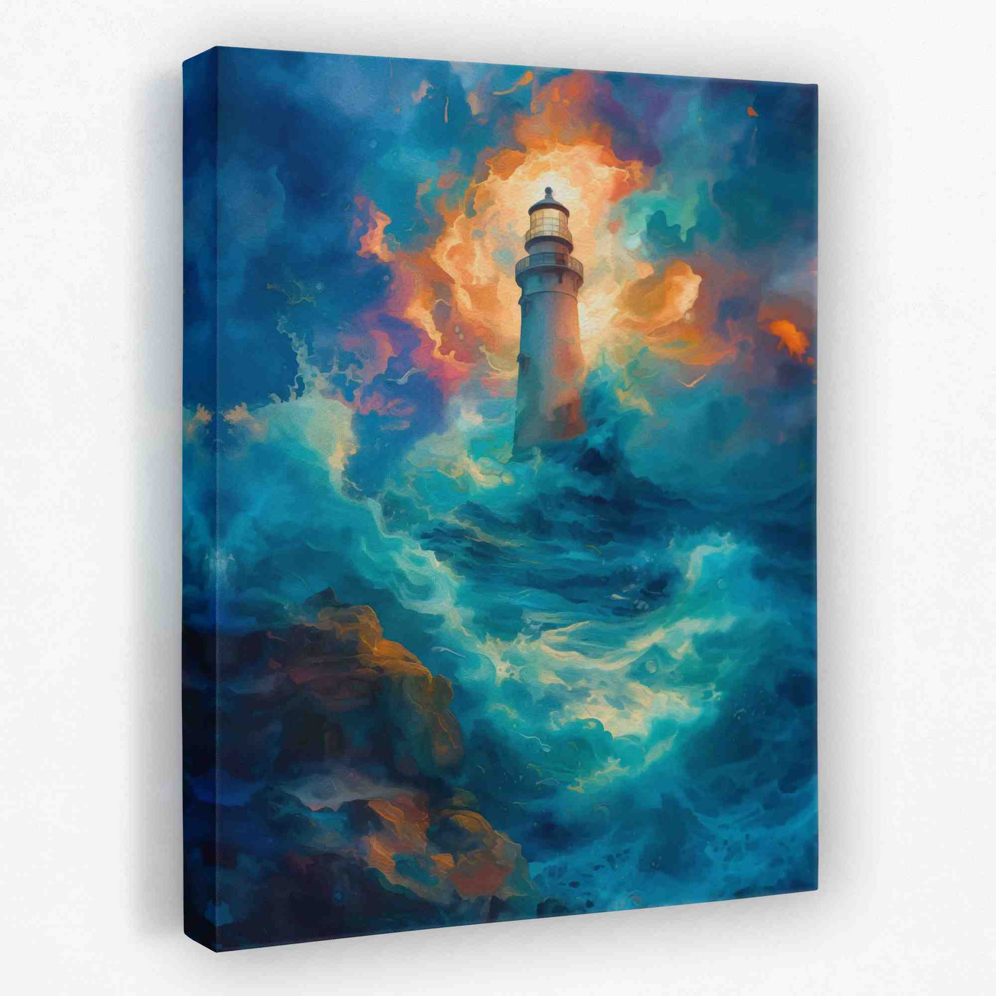 A lighthouse stands resolute as waves crash with relentless power, the drama of ocean meeting stone captured in deep blues and greens. Thrashing Waves balances chaos and calm: the turbulent water creates tension while the steadfast beacon provides hope. The composition feels both dangerous and reassuring.