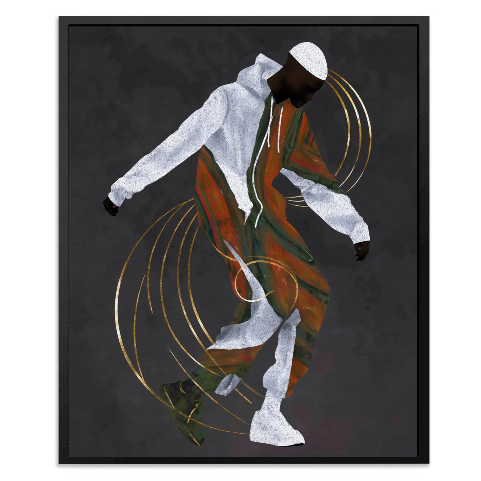 This piece captures the energy of street dance without freezing it. The layered approach and golden accents lift urban subject matter.