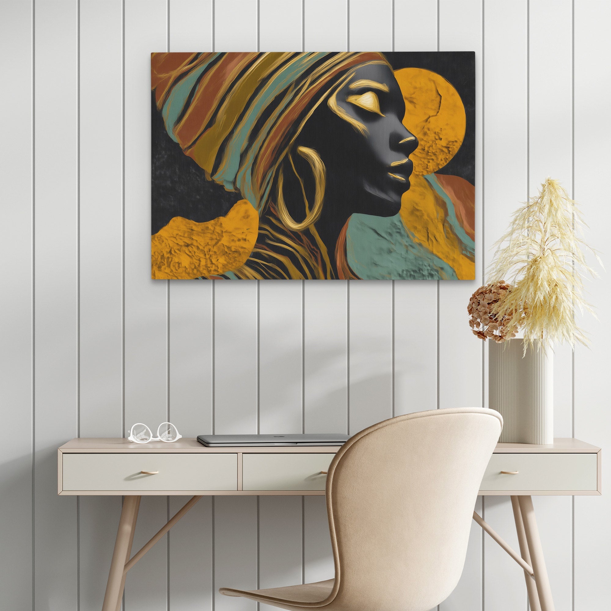 This portrait piece brings dramatic elegance through flowing contemporary styling. The work suits living rooms, bedrooms, or spaces that appreciate stylized figurative art.