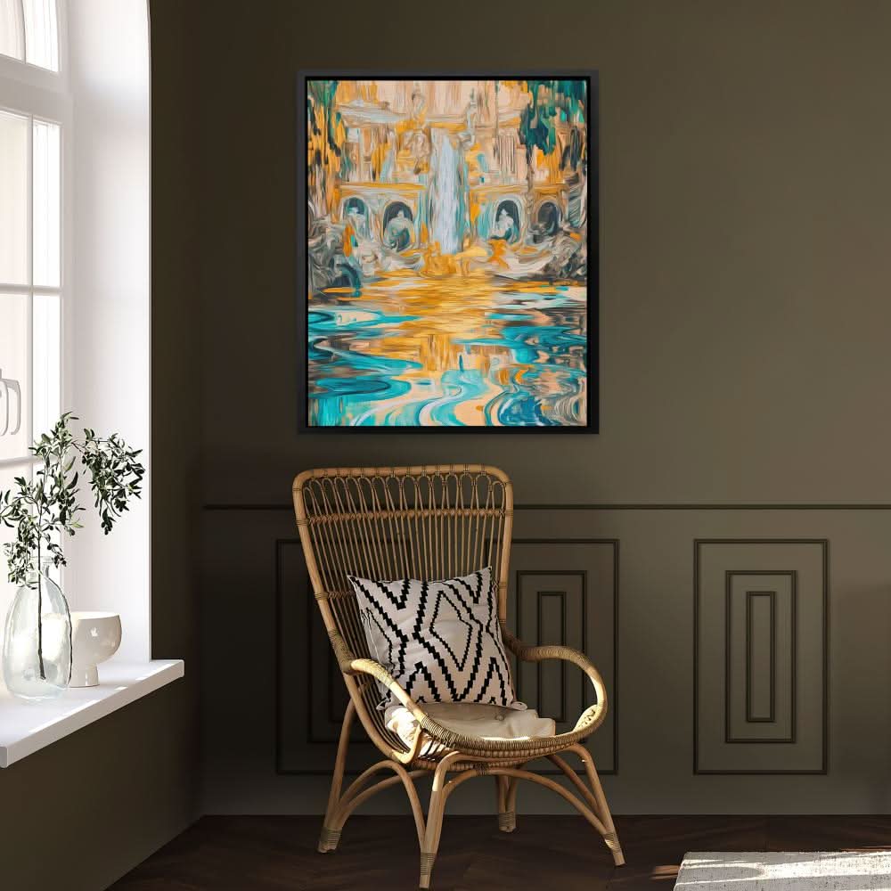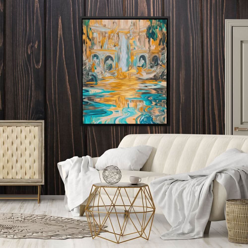 Abstract Golden Falls radiates opulence and movement, blending flowing turquoise waters with rich golden hues that mimic a cascading waterfall against classical architecture. The surreal brushstrokes create an ethereal scene where light, water, and stone merge into a dreamlike spectacle of luxury. This piece evokes grandeur and timeless beauty, making it perfect for those drawn to abstract art with a touch of elegance.